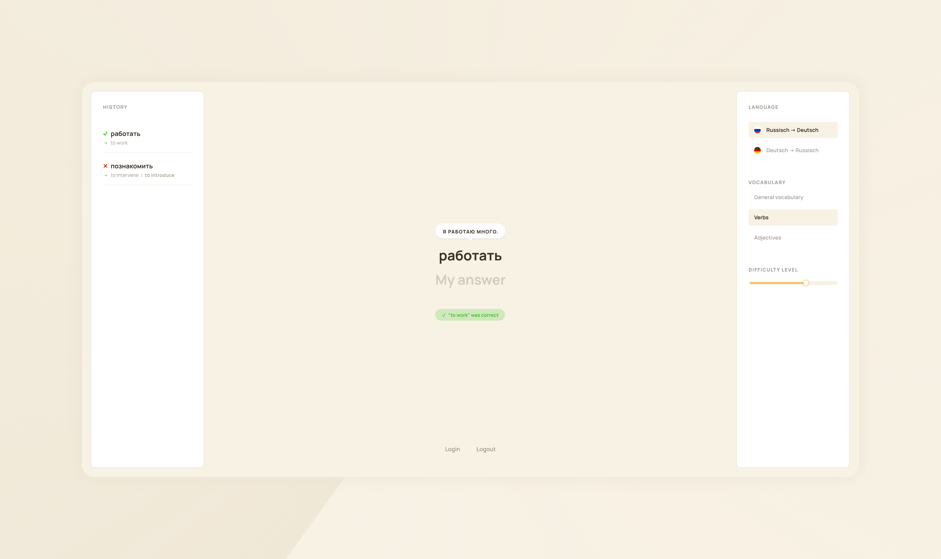 Personal vocabulary learning platform based on Google Spreadsheets. The website randomly displays German or Russian words for me to translate, filtered by various parameters. An internal score, which increases after correct answers and decreases after incorrect ones, allows me to translate more unfamiliar words more often.